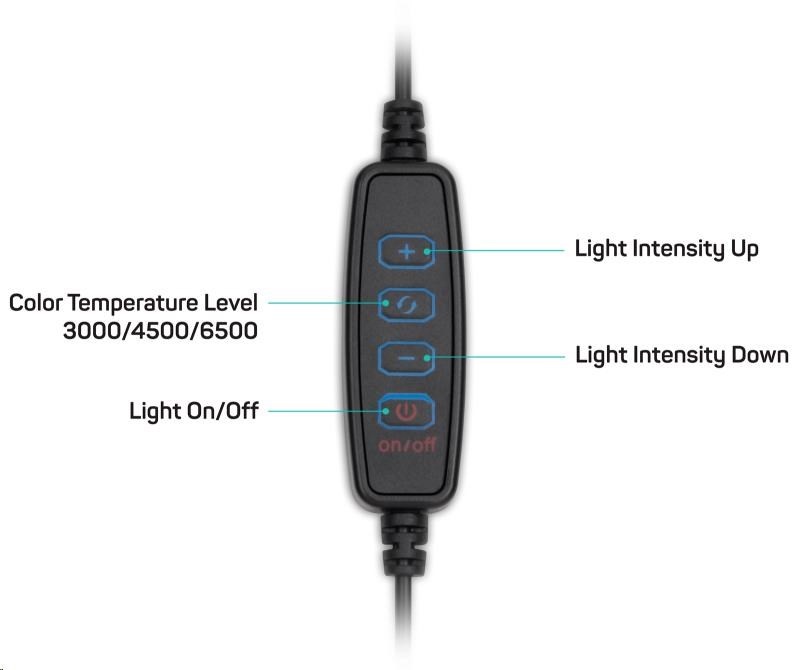 | Obsah balení | - Kruhové LED světlo - Přívodní kabel s dálkovým ovládáním - Flexibilní držák mobilního telefonu - Stativ s kulovou hlavou - Návod k obsluze |