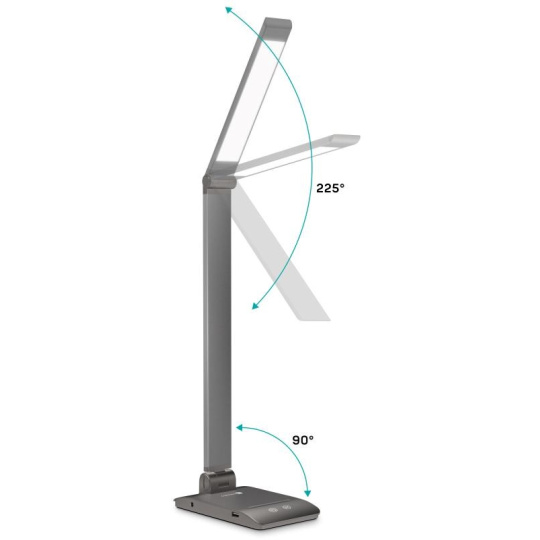 Díky sklopnému rameni a krku nastavíte dokonalý úhel pro jakoukoliv práci. Lampička disponuje USB-A výstupem s výkonem 5 W a dvěma praktickými dotykovými spínači, které umožňují zapnout/vypnout lampu, nastavit 3 úrovně jasu světla nebo nastavit barevnou teplotu světla ve 3 různých úrovních (3000/4000/6500 K).
