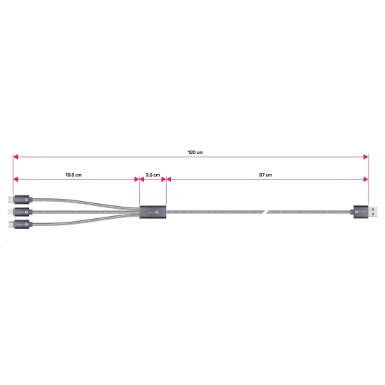 Univerzální nabíjecí kabel 3v1 na nabíjení zařízení s konektory Micro USB, Lightning a USB-C (Type C) umožňuje nabíjení až tří zařízení současně s podporou rychlého nabíjení pomocí max. proudového toku 2 A
