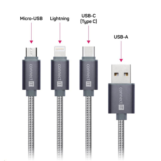 CONNECT IT Wirez 3in1 USB-C & Micro USB & Lightning, silver gray, 1,2 m