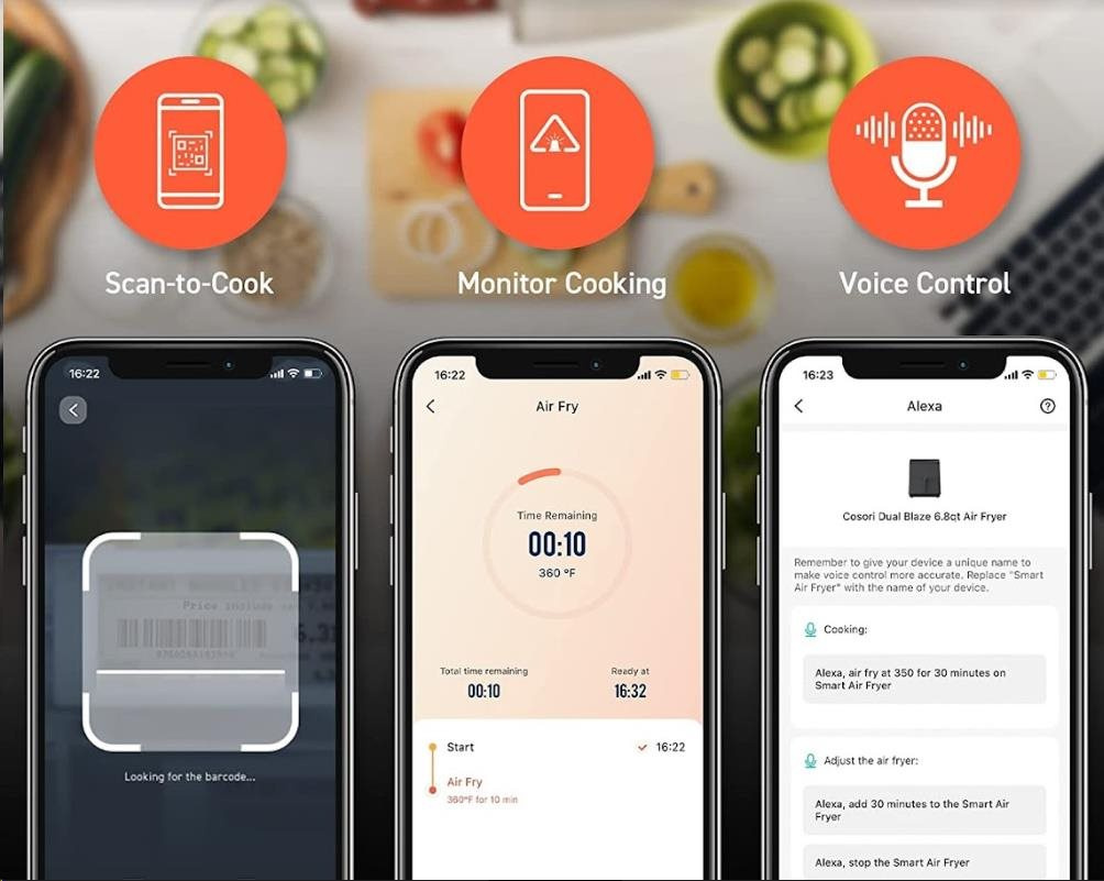 Díky SMART ovládání můžete jídla připravovat pomocí svého smartphonu. Jednoduše si stáhněte bezplatnou aplikaci z Google Play nebo App Store. V aplikaci můžete navolit jednotlivé programy, procházet recepty, sledovat pokrok přípravy jídla nebo nastavit upozornění. Fritéza je také kompatibilní s Amazon Alexa a Google Asistant.