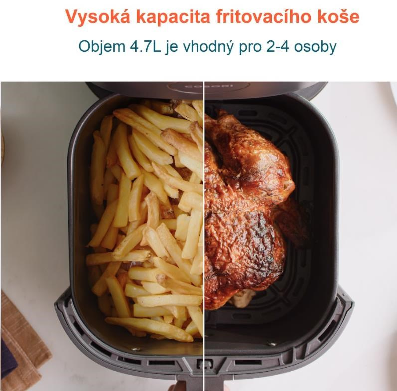 S horkovzdušnou fritézou COSORI CAF-L501-KEUE si můžete užít vaše oblíbená smažená jídla bez výčitek, protože na rozdíl od běžného smažení nebo fritování je v této fritéze možné připravovat jídla za použití velice malého množství oleje nebo vůbec žádného. Kombinace cirkulujícího horkého vzduchu, dokonalé teploty vaření a chytrých programů zajistí, že hranolky budou vždy krásně křupavé a kuřecí stehna šťavnatá. Ať už je vaše jídlo čerstvé nebo mražené, stisknutím tlačítka můžete horkým vzduchem smažit kuřecí křídla, kuřecí prsa, sladké brambory, steaky, čerstvé hranolky a mnoho dalšího. Až budete mít hotovo, čištění bude velice snadné díky nepřilnavému koši, který lze mýt v myčce. Díky nádobě s objemem 4,7l navíc dokážete rychle navařit i větší porce jídla.
