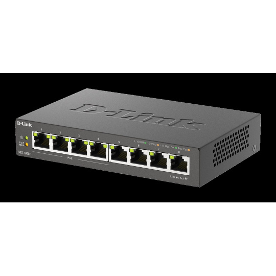 8-port 10/100/1000 Desktop Switch w/ 4 PoE+ Ports - 8-Port 10000BaseTX Auto-Negotiating (NWAY) 10/100/1000Mbps - IEEE 802.3at standard compliant - Includes 4 PoE ports (Ports 1-4) - Auto Half-/Full-Duplex Mode - PoE output up to 30 watts per port - Total power budget 68 watts per switch - Auto-detection of Powered Device - Supports 802.1p QoS and DSCP - Supports Jumbo Frame up to 9720Bytes - Supports cable diagnostics - D-Link Green Technology - 53.5V/1.5A external power supply - Desktop size (No rackmount kit available).