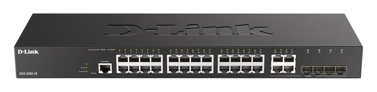 D-Link DGS-2000-28 je plně řízený 28-portový Gigabit Managed switch pro kanceláře a podnikové sítě. Přepínač je osazen 24 porty 10/100/1000M RJ-45 a čtyřmi kombinovanými Gigabit Combo porty RJ-45/SFP, s podporou 100M a 1000M SFP (Mini-GBIC) transceiverů pro optický uplink. Provedení bez ventilátorů zajišťuje tichý chod a umožňuje nasazení přímo v kanceláři, součástí dodávky jsou také držáky pro montáž do 19“ rozvaděče. Switche D-Link řady DGS-2000 nabízí komplexní sadu L2 funkcí, bezpečnostní funkce, funkce kvality služeb (QoS) a základní L3 funkce (max. 4 IP Interfaces, statický routing s max. 128 IPv4/IPv6 záznamy, default route, IPv6 Neighbor Discovery). Řešení případných potíží v sítí usnadňují funkce 802.3ah OAM, diagnostika kabelů a detekce jednosměrné linky (D-Link Unidirectional Link Detection, DULD). ISP poskytovatelé internetu ocení funkce Q-in-Q (Port Based), Multicast VLAN (ISM VLAN) nebo IGMP Authentication / Filtering pro efektivní provoz IPTV služeb. Správa přepínače je přes webové rozhraní, CLI sériovou konzoli, Telnet, SLL, SSH nebo pomocí SNMP příkazů. Pro prvotní konfiguraci a základní správu je k dispozici bezplatný SW nástroj a mobilní aplikace D-Link Network Assistant (DNA), pro centrální správu rozsáhlejších sítí je určena pokročilá platforma D-View 7..