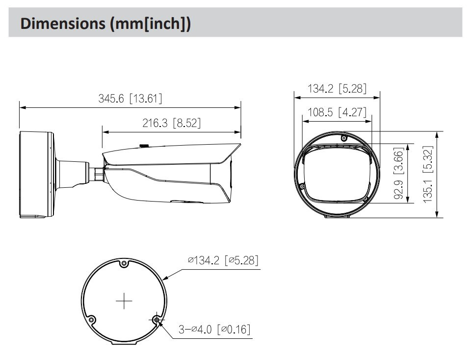 * Níže uvedené parametry a datové listy lze použít pouze pro řadu 5842-Z-S3. Obrazový snímač CMOS 1/1,8" s rozlišením 8 MP, nízkou světelností a vysokým rozlišením obrazu. Výstupy max. 8 MP (3840 × 2160) při 25/30 snímcích za sekundu. Vestavěná infračervená dioda LED a maximální vzdálenost osvětlení je 60 m. ROI, SVC, SMART H.264+/H.265+, AI H.264/H.265, kódování po filtru, flexibilní kódování, použitelné pro různé šířky pásma a úložná prostředí. Režim otáčení, WDR, 3D NR, HLC, BLC, digitální vodoznak, použitelné pro různé monitorovací scény. S algoritmem hlubokého učení podporuje: metadata videa, inteligentní detekci zvuku, IVS, detekci obličeje, inteligentní detekci objektů a počítání osob atd. Alarm: 3 vstupy, 2 výstupy; zvuk: 1 vstup, 1 výstup; RS-485; analogový výstup; výstup napájení; podporuje max. 512 G karty Micro SD, vestavěný duální mikrofon MIC. Napájení 24 VAC/12 VDC/PoE; ePoE. Krytí IP67, IK10. SMD 3.0..