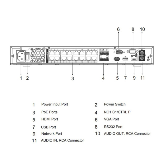 • 1× 10/100/1000 Mbps RJ-45, 16× 10/100 Mbps RJ-45 PoE (IEEE 802.3 af/at), 2× USB 2.0, pozice pro 2× SATA HDD (max. 20 TB/disk), 1× HDMI, 1× VGA, 1× RS-232
