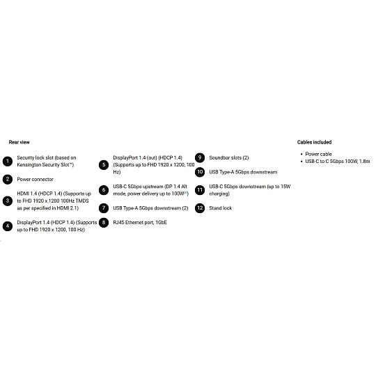 • 1 USB-C 5Gbps upstream port/s (DisplayPort 1.4 Alt Mode, Power Delivery up to 100 W)