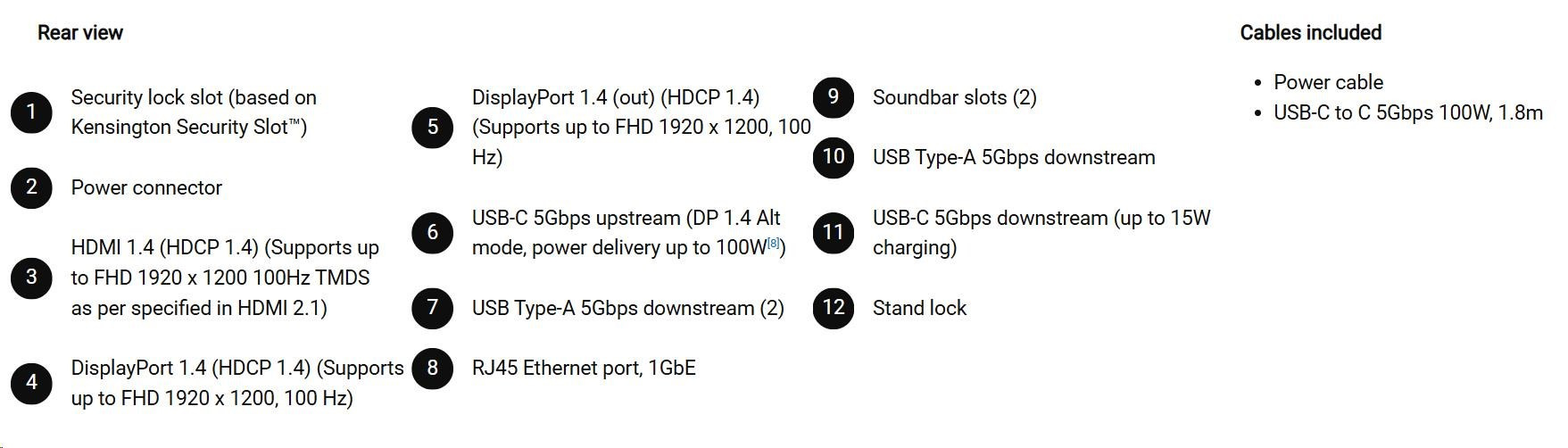 • 1 USB-C 5Gbps upstream port/s (DisplayPort 1.4 Alt Mode, Power Delivery up to 100 W)