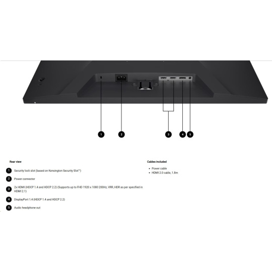 • 2 HDMI ports (HDCP 1.4 and HDCP 2.2) (Supports up to FHD 1920 x 1080 200Hz, VRR, HDR as per specified in HDMI 2.1)