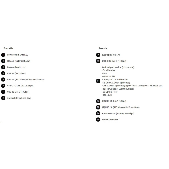 -DisplayPort™ 2.1 (UHBR20) -(2) USB-A 3.2 Gen 2 (10Gbps) -USB 3.2 Gen 2 (10Gbps) Type-C® with DisplayPort™ Alt Mode port -TBT4 (40Gbps) + USB-C (10Gbps) -5G Optical Fiber -5Gbe LAN