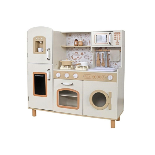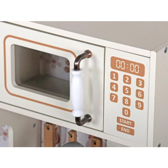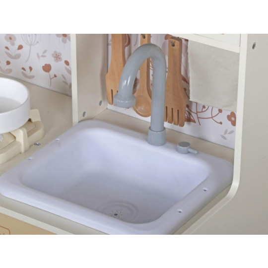 Dětská kuchyňka ve světlých barevných tónech, zdobená květy, je stylovou edukativní hračkou pro děti od 3 let věku. V dřevěné kuchyňce s moderními spotřebiči a tekoucí vodou popustí děti uzdu své fantazii, mohou vařit, péct a ohřívat pokrmy, uvařit kávu a klidně vyprat špinavé prádlo. Jednoduše si vyzkouší dospělácké činnosti bezpečným dětským způsobem. Reálný nádech celé hře dodají zvukové efekty, které vydává sporák nebo vodovodní baterie..