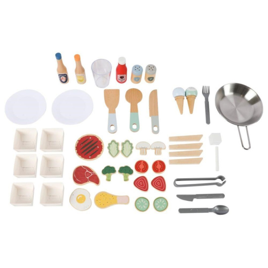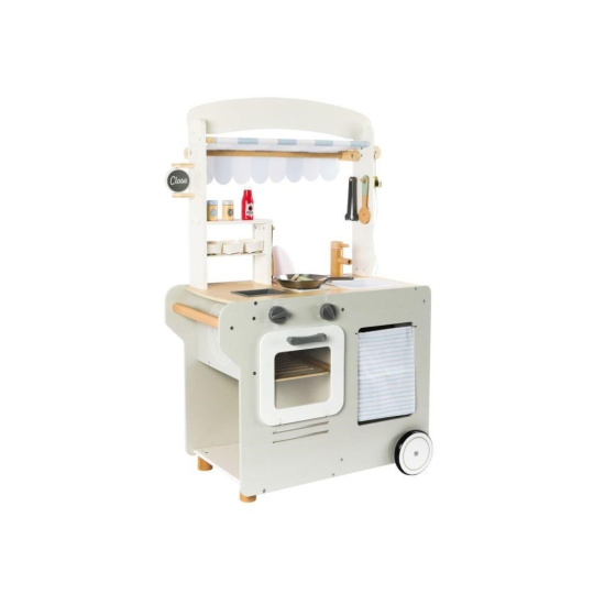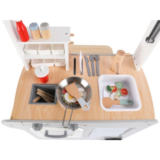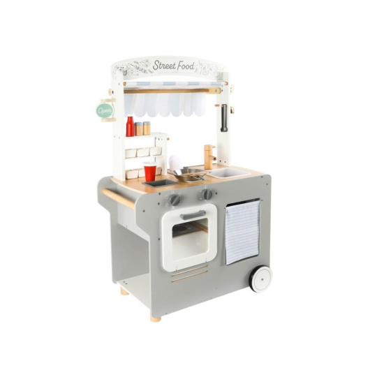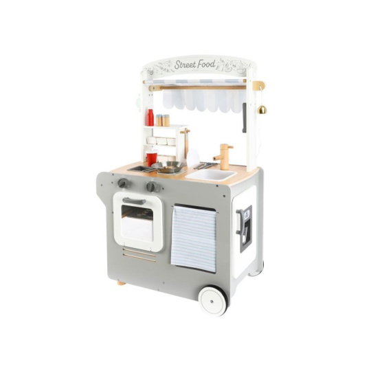 Pojízdná dětská prodejna (občerstvení) je parádním dřevěným obchůdkem, se kterým si děti mohou hrát kdekoliv - ve svém dětském pokoji, v kuchyni, v obývacím pokoji. Pojízdná prodejna je vybavená spotřebiči pro vaření, pečení a smažení, ledovačem, dřezem na nádobí, kuchyňskými potřebami, potravinami, stolečkem se stoličkou, tabulí a dalšími doplňky. Kolečka a dřevěné madlo usnadní přesun i manipulaci..