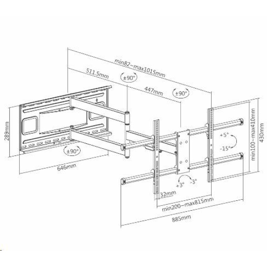 Otáčení Tv 43-80" i kolmo ke zdi na obě strany, délka 82-1015mm, naklápění, VESA 200x100 až 800x400, nosnost 50kg Extra dlouhý držák pro otáčení kolmo ke zdi i velkých televizorů s úhlopříčkou až 80". Díky nastavitelné vzdálenosti od zdi od 82mm až do 1015mm umožňuje držák Ergosolid Largo otočení o 90° na obě strany televizí s úhlopříčkami 43" až 80". Díky nosnosti 50kg a velmi pevné konstrukci je polohování velmi bezpečné a spolehlivé. Televizi je možné naklápět +5° až -15° a korigovat rovinu obrazovky o +/-3°. Díky nástěnnému úchytu s rozměry 646mm a 289mm se celková hmotnost držáku s televizorem velmi dobře rozloží na velkou plochu, instalace je velmi bezpečná. Na držáku je bezpečnostní šrouby pro zajištění Tv na držáku a zamezení nechtěnnému vysazení nebo pádu Tv. Barevné provedení černé, materiál ocel. Záruka 5 let. Technické údaje: nosnost 50kg podporuje VESA standardy 200x100 až 800x400 zavěšení a otáčení kolmo ke zdi Tv 43" až 80" nastavitelná vzdálenost od zdi 82mm až 1015mm možnost naklápění televize +5° až -15° korekce roviny obrazovky +/- 3° instalační materiál součástí balení (viz. níže) velmi pevná a bezpečná konstrukce zajištění Tv na držáku proti vysazení materiál ocel hmotnost držáku 13,5kg velká instalační plocha pro rozložení hmotnosti na zdi 646 x 289mm barevné provedení černé záruka 5 let.