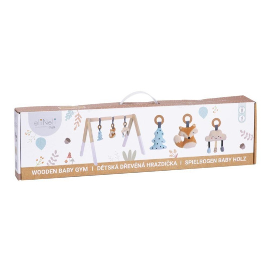 Dřevěná dětská hrazdička se závěsnými hračkami v podobě roztomilé lištičky, stromečku a obláčku upoutá pozornost každého miminka. Dětská hrazdička v neutrálních barvách, vhodná pro holčičky i chlapce, stimuluje dětské smysly, motivuje miminka k pohybu a prozkoumání závěsných prvků. Každou z měkkých hraček můžete z dřevěné hrazdičky sundat a použít jako samostatné hračky..