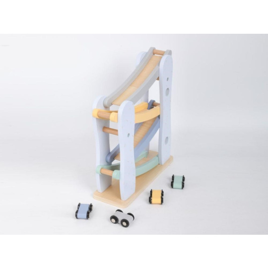 Dřevěná závodní dráha (autodráha) v krásných pastelových barvách, se 4 barevnými autíčky, probudí duši závodníka v každém dítku a nejspíš i v rodičích. Uspořádání závodů se závodními auty přímo v dětském pokoji je zábavnou hrou pro celou rodinu. Rozhodující při této hře je správná koordinace, přesnost, chvíle soustředění, zkrátka správně umístit závodničku na vrchol závodní dráhy..