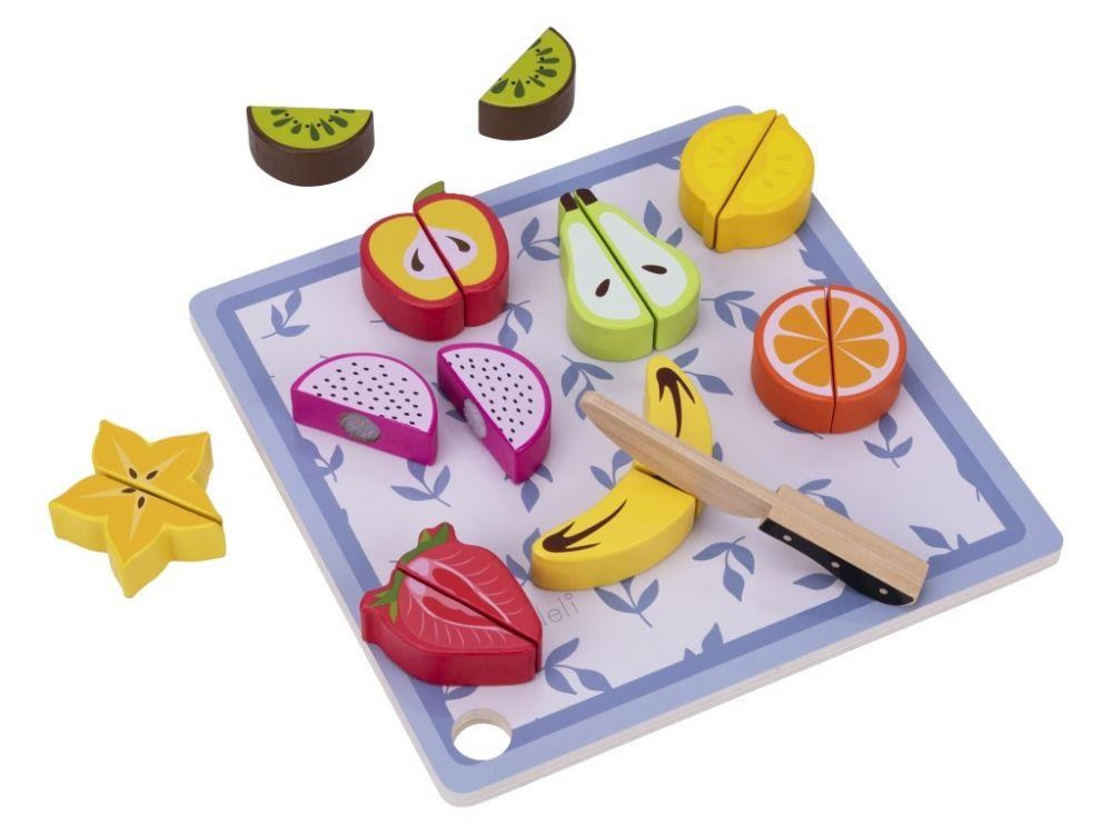 Dřevěné ovoce ke krájení je hračkou, která by neměla chybět v žádné dětské kuchyňce ani dětském obchůdku. Toto krájení je pro děti zcela bezpečné. Půlky ovoce jsou spolu spojený suchým zipem, díky kterému děti ovoce dřevěným nožem jednoduše rozkrojí. Balení obsahuje 9 druhů ovoce, dřevěné prkénko i dřevěný nůž..