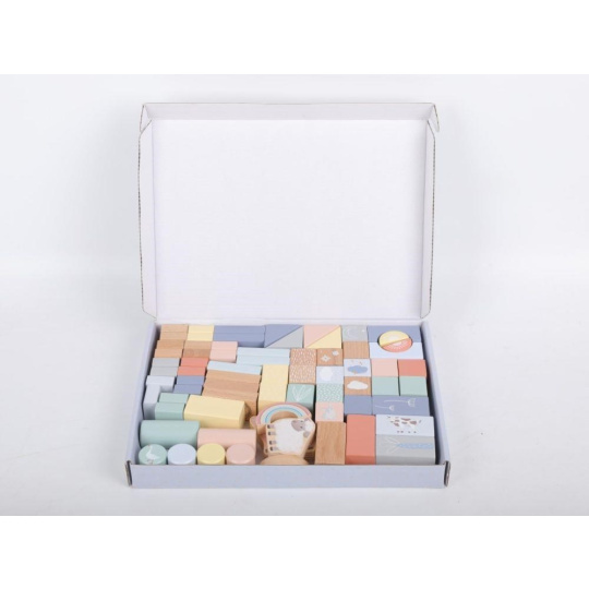 Sada dřevěných kostek s motivem Farma nabízí spoustu možností ke hře. Využití stavebních kostek je široké, přináší spoustu zábavy a zdokonalují dětské dovednosti. Z kostek děti hravě postaví farmu s oblíbenými hospodářskými zvířátky, ovečkou a nafrněným prasátkem, využijí je při hře s autíčky a hracími koberci. Sada 70 kostek je montessori hračkou se zvířátky v realistickém provedení..