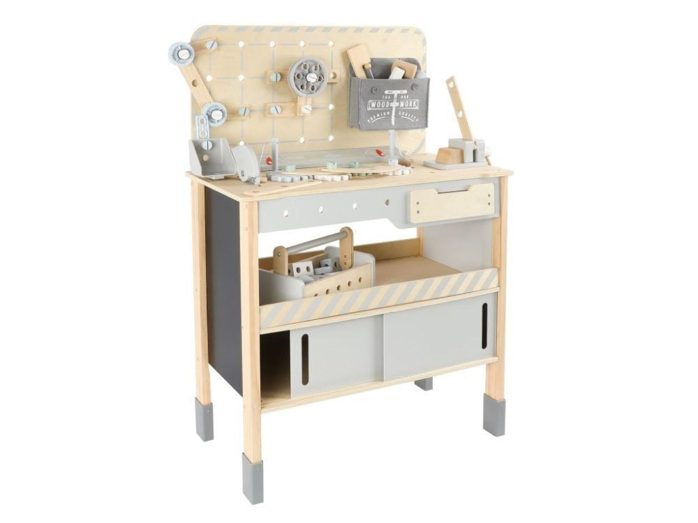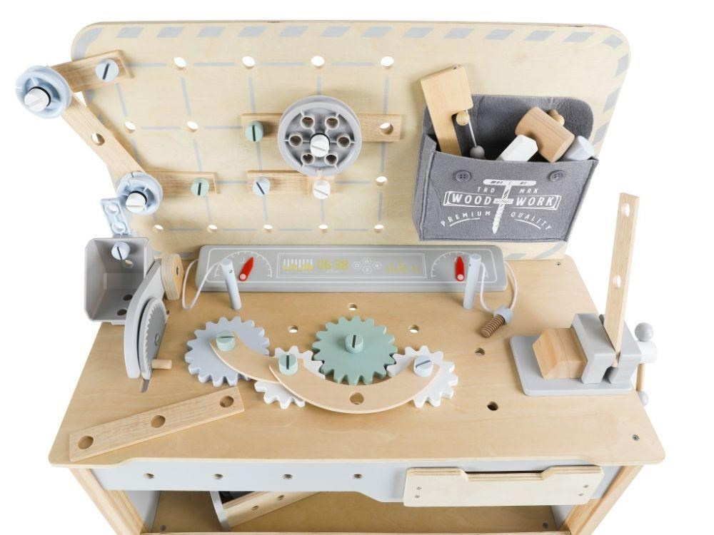 Dětský dřevěný ponk XXL se spoustou příslušenství, parádním jeřábem a opaskem na nářadí ZDARMA nadchne každého malého kutila. Dětský ponk v kombinaci šedé barvy s barvou přírodního dřeva, s jeřábem, nářadím, šrouby, destičkami a hlavně se spoustou vychytávek potrénuje jemnou motoriku, manuální zručnost, koordinaci očí a rukou, rozvíjí kreativitu, učí děti soustředit se a trpělivosti..