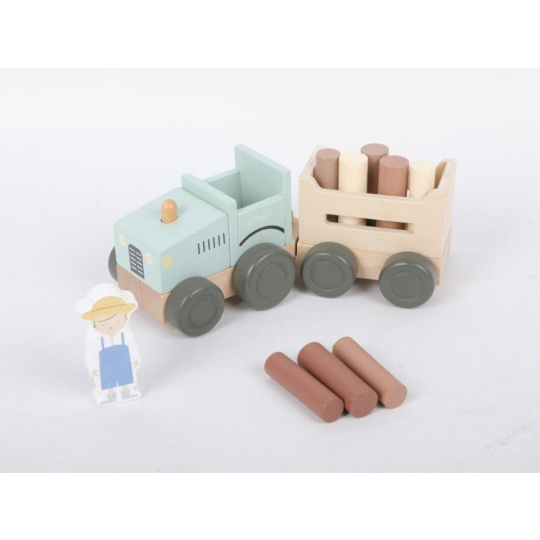 Parádní dřevěný traktor v jemné zelenkavé barvě, s traktoristou, vlečkou a nákladem v podobě klád (dřevěný válečků), promění děti ve skutečné farmáře. S tímto dřevěným traktorem se děti vydají do lesa na dříví, mohou převážet zvířátka z farmy a jakékoliv jiné hračky, kostky, co se jim podaří na vlečku naložit. Při hře s traktůrkem děti hrají role, zdokonalují motorické dovednosti a koordinaci očí a rukou..