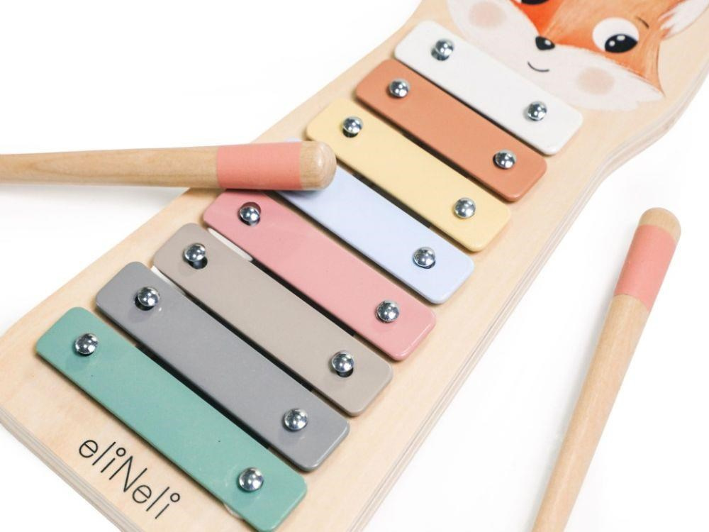 Roztomilý dřevěný xylofon s motivem lišky okouzlí děti jemnými pastelovými barvami. Kovové destičky na liščím bříšku se při úderech dřevěnou paličkou (součástí balení jsou 2 paličky) rozezní a přenesou malé hudebníky do světa tónů a barev hravou a zábavnou formou.