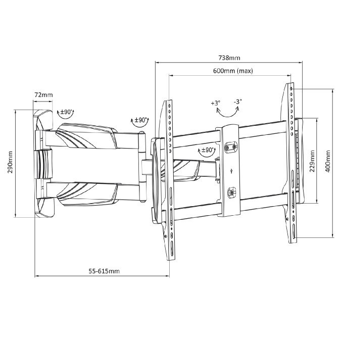 Držák LED Tv Fiber Mounts M8C33 Nástěnný držák pro zavěšení televize 37-70", otočný +/-90°, sklopný +10°/-15°, vzdálenost Tv od zdi 55-615mm, korekce roviny +/-3°, krytky na kabely, VESA 200x100 až 600x400, nosnost 35kg Kvalitní nástěnný držák robustní velmi pevné konstrukce se kterým nastavíte televizi do polohy, kterou potřebujete. Otáčení do stran, náklon, délkové nastavení, korekce roviny. Krytky na uchycení veškeré kabeláže. Dodáváme včetně instalačního materiálu. Výsuvný otočný a sklopný držák Tv 37-70" Fiber Mounts M8C33Kvalitní držák na televize pro zavěšení na zeď a manipulaci Fiber Mounts M8C33 Technické údaje: nosnost 35kg podporuje VESA standardy 200x100 až 600x400 ideální na televizory s úhlopříčkou 37 - 70" nastavení vzdálenosti od zdi 55 mm až 615 mm otáčení do stran +/- 90 ° náklon obrazovky nahoru až +10 ° a dolů až -15 ° korekce roviny +/- 3 ° kryty na uchycení kabeláže velmi spolehlivá bytelná konstrukce snadné polohování televize barva černá záruka 5 let Kvalitní a spolehlivý pohyblivý držák na televize Fiber Mounts M8C33 Držák Tv Fiber M8C33 podporuje VESA standardy: VESA 200x100 VESA 200x200 VESA 300x200 a 200x300 VESA 300x300 VESA 400x200 a 200x400 VESA 400x300 a 300x400 VESA 400x400 VESA 600x400 Držák M8C33 je vhodný na všechny značky a typy televizorů, které mají hmotnost do 35 kg a které podporují kterýkoliv z výše uvedených VESA standardů..