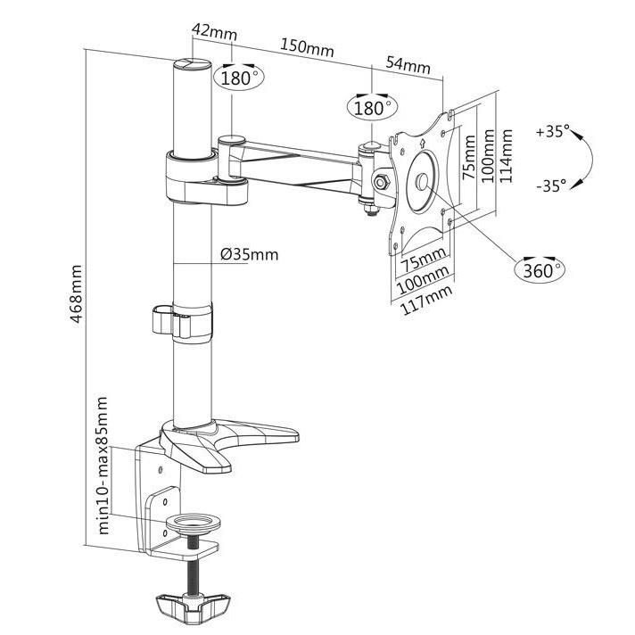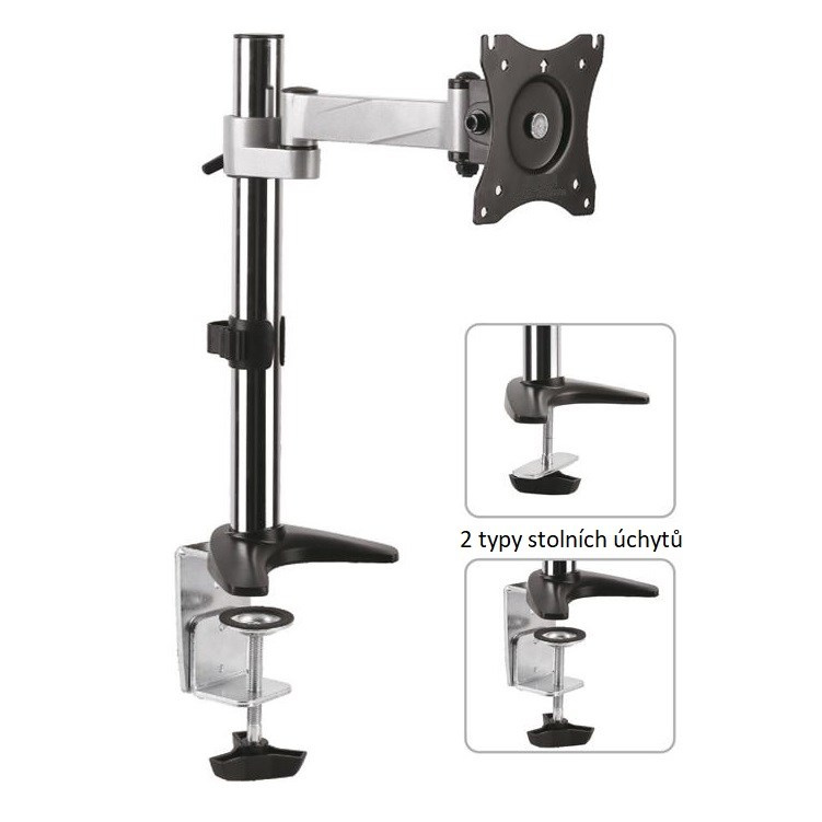 Kvalitní stolní držák pro monitory 13-32", otočný +/-180°, sklopný +/-35°, nastavení výšky 100-380mm, nastavení vzdálenosti od úchytu 50-204mm, funkce pivot, VESA 75x75 a 100x100, nosnost 8kg.... více