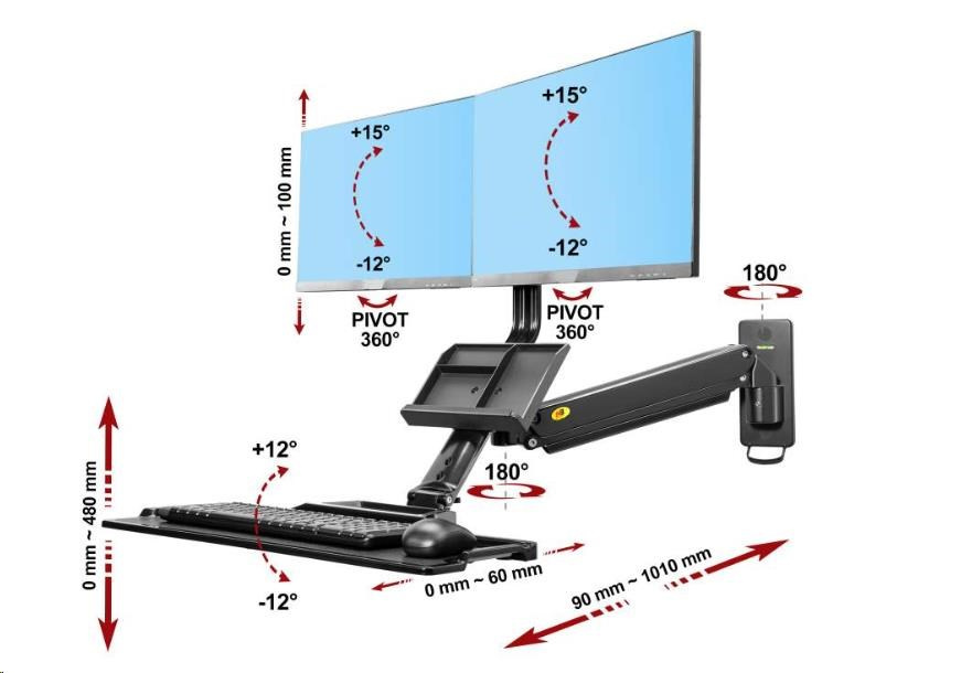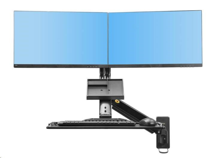 Držák na 2 monitory a klávesnici Fiber Mounts MC27-2AB Profesionální nástěnná pracovní stanice na 2 monitory 17-27" a klávesnici s myší Pracovní stanice s nástěnným držákem na 2 monitory (uchycení vedle sebe) s policí na klávesnici a myš. Kompletní nastavení pozic monitorů i police, plná polohovatelnost - otáčení, naklápění, výškové polohování, odsazení od zdi. Instalace na svislé povrchy (zeď, příčka, sloupek, pilíř, stroje atd.). Nejvyšší kvalita, krásný dizajn, snadná ovladatelnost - profesionální výrobek. Barva černá, záruka 3 roky. Nástěnná pracovní stanice s držákem na 2 monitory a policí na klávesnici a myš, výškové polohování pro práci v sedě i vestoje, otáčení naklápění - Fiber Mounts MC27-2AB Technické údaje: minimální zatížení 6kg (kvůli tuhosti plynového pístu) maximální zatížení 12kg ideální na monitory s úhlopříčkou 17" až 27" nastavení požadované pozice monitorů naklápění +10° až -15° výškové polohování od police 100mm funkce pivot maximální vzdálenost mezi držáky monitorů 670mm polohování ramene držáku otáčení do stran +180°/-180° výškové polohování 480mm nastavení vzdálenosti od zdi 90mm (zaklopená polička) až 1010mm polička na klávesnici s myší rozměry 560mm x 200mm nastavení náklonu police +12°/-12° úprava vzdálenosti police od monitorů až 60mm možnost zaklopení police na klávesnici a myš přihrádka na dokumenty, poznámky,vizitky, zápisník atp. systém vedení kabeláže profesionální zpracování, nejvyšší kvalita barevné provedení černé záruka 3 roky.