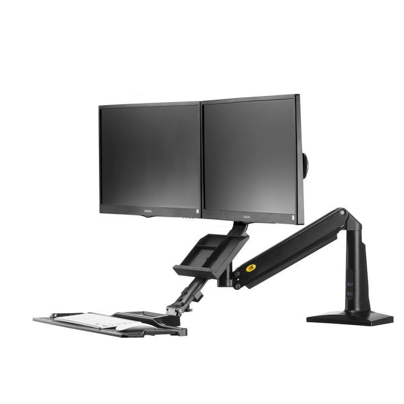 Stolní držák na 2 monitory a klávesnici NB FC24-2A-B Profesionální pracovní stanice pro dva monitory 17-27" s policí na klávesnici a myš, ergonomický držák pro rychlou změnu pro práci vsedě nebo vestoje, plná polohovatelnost, VESA 75x75 a 100x100, plynová pružina, nosnost 15kg Profesionální stolní držák na 2 monitory 17-27" s policí na klávesnici a myš, ergonomický pro práci ve stoje nebo vsedě se snadným a rychlým výškovým polohováním 480mm. Monitory lze na držáku posouvat do stran, naklápět, otočit na šířku nebo na výšku, mírně natáčet do stran, výškově polohovat. Extrémně snadné výškové polohování celého držáku díky plynové pružině, během okamžiku můžete změnit pozici vsedě na pozici vestoje a otočit držák do stran +/- 180°. Profesionální kvalita s důrazem na dizajn, 2x USB porty 3.0, systém pro vedení kabeláže, snadná instalace na stolové desky o průměru 10-95mm. Barevné provedení černé, záruka 3 roky. Pracovní stanice na 2 monitory 17-27" s policí na klávesnici a myš, ergonomický pro práci vsedě nebo vestoje NB FC24-2A Technické údaje: nosnost minimální 9kg / maximální 15 kg VESA standard 75x75 a 100x100 na monitory a displeje s úhlopříčkou 17-27" naklápění monitorů +16° / -10° nastavení výšky monitoruod police +/- 191 mm výškové polohování celého držáku +/- 480 mm maximální výška od pracovní desky 1011 mm otáčení do stran +/- 180° funkce PIVOT - otočení monitorů na šířku nebo na výšku úprava vzdálenosti police 0 ~ 60 mm rozměry police na klávesnici 560x200 mm organizátor pod obrazovkou o rozměrech 220x160 mm dva porty USB 3.0 systém vedení kabeláže ergonomický držák pro rychlé nastavení pro práci vsedě nebo vestoje uchycení na okraj stolu, stolové desky o síle 10-95mm profesionální kvalita a zpracovnání jednoduchá montáž a velmi snadné polohování barevné provedení černé záruka 3 roky Držák NB FC24-2A-B podporuje VESA standardy: VESA 75x75 VESA 100x100.