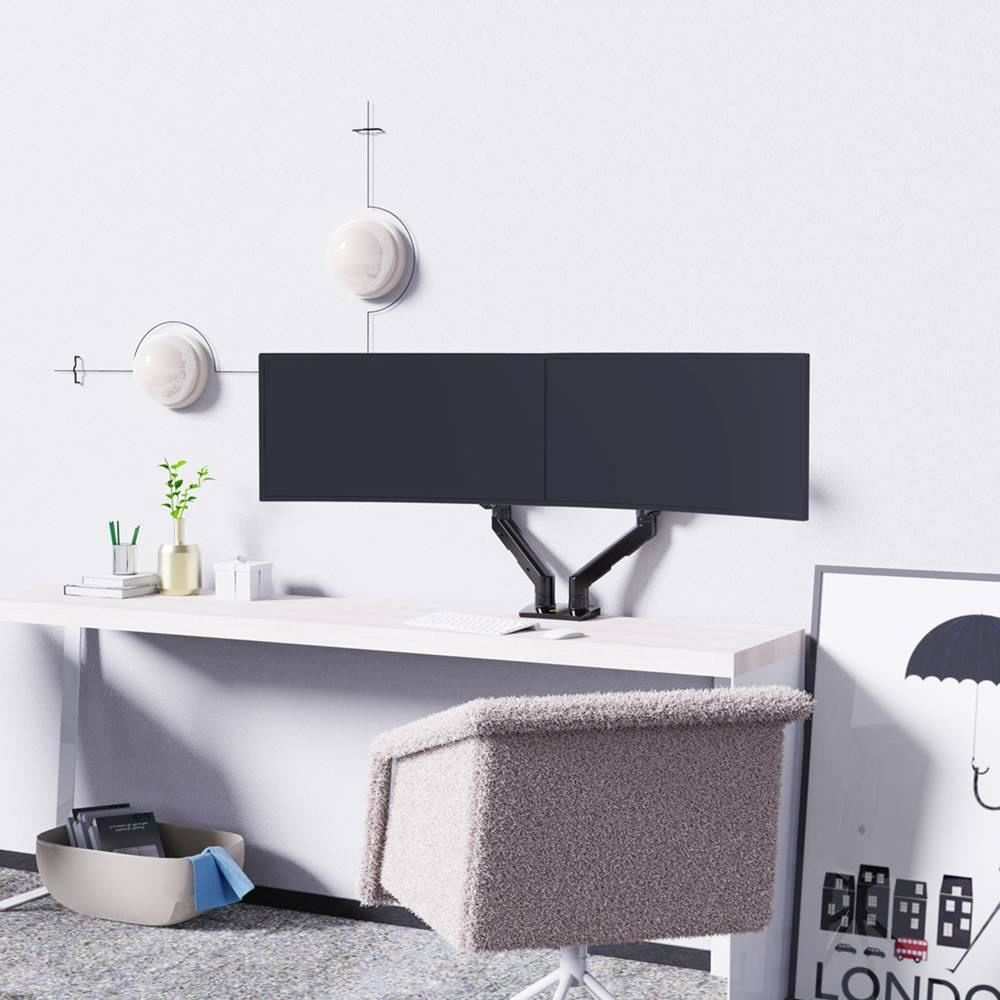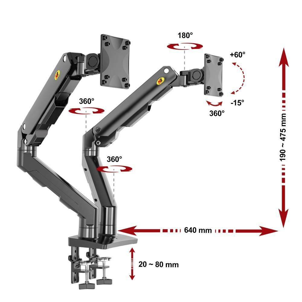 Stolní držák na 2 monitory NB G55 Profesionální stolní držák na 2 monitory 24-34", nezávislé polohování každého ramene, otáčení +/-180°, naklápění +60°/-15°, nastavení výšky 190-475mm, délky o uchycení 0-640mm, 1x USB, vedení kabeláže, 2 stolní úchyty, VESA 75x75 a 100x100, nosnost 2x16kg Stolní držák pro zavěšení 2 monitorů / Tv / displejů s úhlopříčkou 24-34". Nezávislé nastavení polohy každé obrazovky dle potřeby. Ramena mají plynový píst, který je nutné nastavit na hmotnost zavěšené obrazovky od 5kg do 16kg. Výškové polohování od 190mm do 475mm, otáčení do stran +/- 180°, naklápění +60°/-15°, nastavení vzdálenosti od stolního uchycení 0-640mm, funkce pivot +/- 360°, podpora VESA 75x75 a 100x100 s možností zakoupení nástavce na 100x200, 200x100 a 200x200. Dodáváme včetně 2 typů stolních úchytů na desky 20-90mm: svěrák pro fixaci na okraje stolů a šroubovice pro fixaci do prostoru stolové desky přes otvor 10-50mm. Systém pro vedení kabeláže. Instalační materiál. Barevné provedení černé. Nejvyšší kvalita. Záruka 5 let. Profesionální stolní kancelářský držák na 2 monitory NB G55 Technické údaje: nosnost 32kg minimální hmotnost 1 obrazovky je 5kg a maximální 16kg ramena mají plynový píst pro výškové polohování s nastavením na hmotnost obrazovky ideální na monitory a Tv s úhlopříčkou 24-34" držáky podporují VESA standardy 75x75 a 100x100 nezávislé polohování každého ramene otáčení do stran +/- 180° naklápění dolů až -15° a nahoru až +60° nastavení vzdálenosti od stolního úchytu 0-640mm nastavení výšky 190-475mm (+/-285mm) funkce pivot: rotace +/- 360° systém pro vedení kabeláže 1x USB port na stolním úchytu 2 typy úchytů na (stolové) desky 20-90mm: na okraj nebo do prostoru přes otvor 10-50mm nejvyšší kvalita provedení barva černá záruka 5 let Profesionální držák pro zavěšení dvou monitorů na stůl NB G55 Držák na 2 monitory NB G55 podporuje VESA standardy: VESA 75x75 VESA 100x100 Držák umožňuje snadné výškové polohování monitoru od 190mm do 475mm díky plynovým pístům. Ty je nutné nastavit na hmotnost zavěšeného monitoru od 5kg do 16kg. Hmotnost monitoru nesmí být nižší jak 5kg, jinak nebude možné výšku měnit, monitor by byl stále v nejvyšší poloze. Držák na 2 monitory do kanceláře nebo pracovny NB G55 2 typy uchycení na stoly / desky: svěrák s 2 bodovým fixováním na desky o síle 20-90mm šroubovice, fixace k desce 20-90mm přes otvor 10-50mm 2 způsoby uchycení na stolové desky NB G55 Držáky NB G55 jsou vhodné na: klasické rovné monitory prohnuté (curved) monitory širokoúhlé monitory televizory All in One Pc dotykové obrazovky - monitory i televizory zobrazovací panely s podporou VESA.