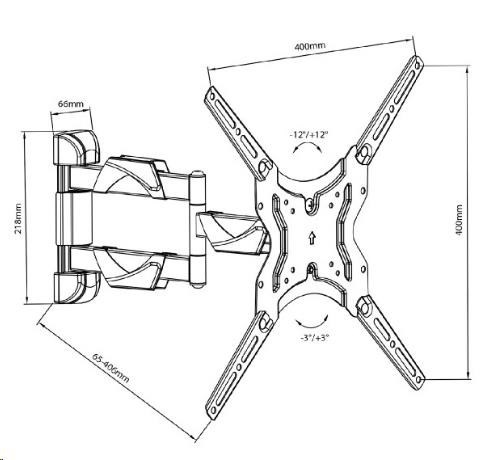 ynikající držák pro zavěšení plochých televizorů s úhlopříčkou 13-52 palců, otočný a sklopný, délkově nastavitelný Levný, přesto vynikající držák pro zavěšení všech typů a značek plochých televizorů na stěnu. Držák umožňuje otáčení do stran, náklon dole i nahoru, korekci roviny, nastavování vzdálenosti obrazovky od stěny. Ocelová konstrukce zajišťuje spolehlivé a bezpečné zavěšení Tv, nechybí ani zajištění proti vysazení. Technické údaje: nosnost 30kg podporuje VESA standardy 75x75 až 400x400 vhodný pro zavěšení všech typů a značek plochých televizorů doporučená úhlopříčka televizoru 13 až 52 palců otáčení do stran +/- 90° náklon dole i nahoru +/- 12° nastavitelná vzdálenost od zdi 65 až 406mm korekce roviny +/- 3° designové krytky na fixování kabeláže vynikající kvalita ocelová konstrukce zajištění proti vysazení Tv snadná a rychlá montáž barevné provedení černé záruka 3 roky Držák Tv Fiber Mounts D7C43 podporuje VESA standardy: VESA 75x75 VESA 100x100 VESA 200x100 VESA 200x200 VESA 300x300 VESA 400x200 VESA 400x300 VESA 400x400.