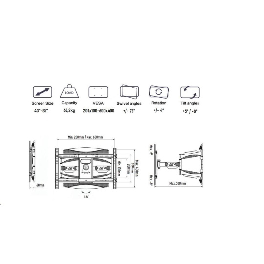 Držák na Tv NB P65 Profesionální držák na zavěšení Tv 43" - 85" na zeď, umožňuje otáčení do stran až +75° / -75°, naklápění +5° / -8°, nastavení vzdálenosti od zdi 60 - 500 mm, podporuje VESA standardy 200x100 až 600x400, korekce roviny +4° / -4°, systém pro skryté vedení kabeláže, nosnost 68,2 kg Potřebujete zavěsit LCD nebo LED televizor na zeď a otáčet s ním do stran, případně naklonit nahoru nebo dolů? Požadujete pouze nejvyšší kvalitu, bezpečnost a krásný design? V tom případě Vám doporučujeme držák NB P65: Profesionální špičkový držák na televize NB P65 NB P65 je vhodný pro zavěšení všech typů televizorů s hmotností do 68 kg a podporou VESA standardu 200x100 až 600x400, obecně na televizory s úhlopříčkou 43" - 85". Po zavěšení snadno televizor nastavíte do požadované polohy - otáčení do stran, náklon, vzdálenost od zdi, korekce roviny. Držák podporuje skryté vedení kabeláže. Dodáván je včetně veškerého montážního materiálu a malé vodováhy. Konstrukce držáku Tv NB P65 je na vynikající úrovni jak kvalitou tak provedením. Vhodný je i pro každodenní manipulaci s obrazovkou. Televizní držák otočný do stran a sklopný NB P65 Technické údaje: maximální zatížení 68,2 kg podporuje VESA standardy 200x100 až 600x400 doporučujeme na Tv s úhlopříčkami 43" až 85" otáčení do stran až +75° / -75° náklon +5° / -8° korekce roviny +4° / -4° minimální vzdálenost Tv od zdi 60 mm maximální vzdálenost Tv od zdi 500 mm systém pro skryté vedení kabeláže kvalitní ocelová konstrukce montážní materiál součástí balení zajištění Tv proti vysazení záruka 5 let.