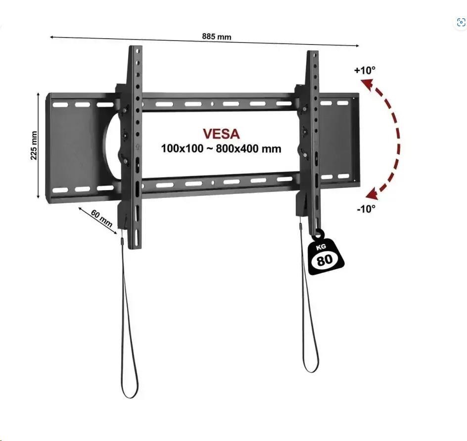 Držák televizoru Fiber Novelty C5T Profi sklopný držák na středně velké i rozměrné televizory / monitory 45" - 90", náklon +10° / -10°, vzdálenost 60mm, automatické zajištění Tv proti vysazení, instalační plocha 885 x 225mm, instalační materiál, VESA 100x100 až 800x400, nosnost 80kg Profesionální naklápěcí držák na středně velké i rozměrné televizory, monitory a displeje s úhlopříčkou 45" až 90". Držák vyniká pevnou konstrukcí s nosností 80kg, velkou instalační plochou s mnoha otvory pro ukotvení do zdi. Vzdálenost od zdi je 60mm, což zajišťuje dostatečný prostor pro odvětrávání a umožňuje naklonění Tv až o +10° / -10°. Držák podporuje VESA standardy 100x100 až 800x400 a má systém automatického zajištění Tv na držáku proti nechtěnému vysazení. V balení naleznete instalační materiál, malou vodováhu a přehledný manuál. Barevné provedení černé, záruka 5 let. Nástěnný držák na televize C5T umožňuje naklápění až 10 stupňů nahoru i dolů Technické údaje: nosnost 80kg na Tv / monitory / displeje s úhlopříčkou 45" až 90" podporuje VESA standardy 100x100 až 800x400 vzdálenost od zdi 60mm možnost naklápění nahoru i dolů +10° / -10° systém pro automatické zajištění obrazovky na držáku, uvolnění pomocí táhel kvalitní velmi pevná konstrukce instalační plocha 885 x 225mm, mnoho otvorů pro ukotvení na zeď instalační materiál + vodováha barevné provedení černé záruka 5 let Fiber Novelty C5T profesionální sklápěcí držák na televizory / monitory Držák TV C5T podporuje VESA standardy pro zavěšení: VESA 100x100 VESA 200x100 a 100x200 VESA 200x200 VESA 300x200 a 200x300 VESA 300x300 VESA 400x200 a 200x400 VESA 400x300 a 300x400 VESA 400x400 VESA 600x400 VESA 800x400 VESA držák na Tv pro zavěšení na stěnu C5T Držáky C5T dodáváme včetně instalačního materiálu: 4ks šrouby M6x14mm 4ks šrouby M6x30mm 4ks šrouby M8x16mm 4ks šrouby M8x35mm 4ks podložek 4ks distanční váleček 5mm 4ks distanční váleček 15mm 6ks hmoždinka (cihla, beton, dřevo) 6ks vrut 1ks imbusový klíč 4mm 1ks instalační mini-vodováha přehledný instalační manuál Pokud dodávaný instalační materiál není vhodný pro uchycení právě vaší obrazovky, je nutné zakoupit (železářství) 4ks šroubů v potřebném průměru a délce..