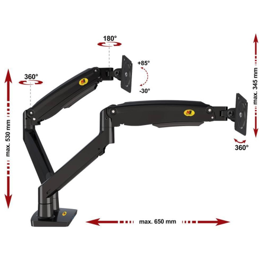 Dvojmonitorový stolní držák NB F195AB Profesionální stolní držák na 2 monitory 19-37", 3D nezávislé nastavení polohy, design, kvalita, ergonomie, VESA 75x75 a 100x100, nosnost 18kg Špičkový profesionální stolní držák pro zavěšení 2 monitorů a jejich nezávislé nastavení polohy: otáčení do stran, nastavení výšky, nastavení vzdálenosti od stolního úchytu, náklon, rotace obrazovky. korekce roviny. Hmotnost každého monitoru musí být v rozmezí 3-9kg. Balení obsahuje 2 typy úchytů na stolovou desku, instalační materiál a návod. Barevné provedení černé. Záruka 3 roky. Stolní držák na 2 monitory 19-37" do kanceláře nebo pracovny NB F195AB Technické údaje: celková nosnost 18kg hmotnost každého monitoru musí být v rozmezí 3 ÷ 9 kg podpora VESA standardu 75x75 a 100x100 v případě potřeby za příplatek možnost rozšíření VESA na 200x100 nebo 200x200 doporučená úhlopříčka monitorů 19" až 37" nezávislé nastavení výšky: min. 220mm, max. 565mm nezávislé otáčení monitoru do stran +/- 180° nezávislé naklonění monitoru +53° až -8° nezávislá rotace monitoru - otočení monitoru na šířku nebo na výšku, korekce roviny nezávislé nastavení vzdálenosti od stolního úchytu: 0mm až 700mm uchycení na stolové desky o průměru 10mm až 90mm balení obsahuje 2 typy úchytů na stolové desky (svěrák na okraj stolu + šroubovice do prostoru stolu) 2x USB port vynikající kvalita, krásný design snadné nastavení polohy monitorů spolehlivost, bezpečnost barevné provedení černé, stříbrné nebo bílé záruka 3 roky Polohovatelný stolní držák 2 monitorů do kanceláří a pracoven NB F195AB Dvojmonitorový stolní držák podporuje VESA standardy: VESA 75x75 VESA 100x100 za příplatek rozšíření na VESA 200x100 za příplatek rozšíření na VESA 200x200.