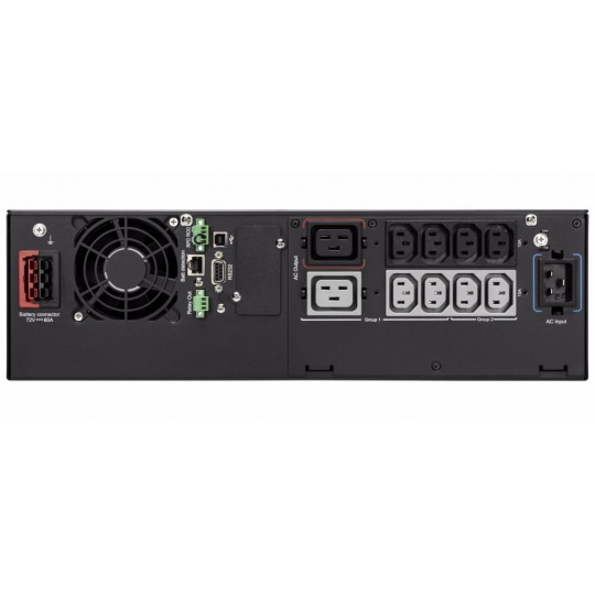 | Komunikace | USB port (kompatibilní s HID) Sériový port (RS232) Mini svorkovnice pro dálkové zapnutí / vypnutí (ROO) a vzdálené vypnutí (RPO) Mini svorkovnice pro výstupní relé Bezpotenciálové kontakty (3 výstupy, 1 vstup, optočlen, DB9) |