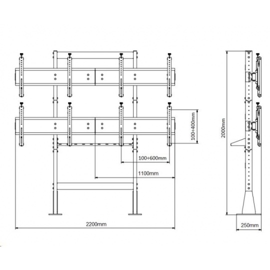 Technické údaje: maximální zatížení 210kg maximální hmotnost 1 monitoru nebo televizoru 50kg na televizory a monitory s úhlopříčkou 50÷57" zavěšení obrazovek v horizontální poloze podpora VESA standardu 100x100 ÷ 600x400mm výška televizní stěny 2000mm výškové nastavení každé řady monitorů dle potřeby posun monitorů do stran zajištění proti vysazení monitoru nutné ukotvení do podlahy profesionální televizní stěna nejvyšší kvality a zpracování snadné sestavení, rychlá montáž záruka 10 let Podporované VESA standardy: VESA 100x100 VESA 200x100 a 100x200 VESA 200x200 VESA 300x200 a 200x300 VESA 300x300 VESA 400x200 a 200x400 VESA 400x300 a 400x400 VESA 400x400 VESA 600x400.