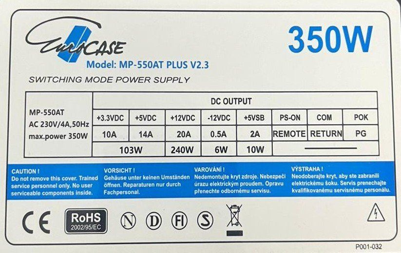 Napájecí zdroj ATX značky Eurocase s výkonem 350W. Je osazen 120mm ventilátorem a pasivním PFC (Power factor correction). Otáčky ventilátoru jsou řízeny termoregulací. Zdroj splňuje požadavky na elektrickou bezpečnost a elektromagnetickou kompatibilitu. Zdroj vyhovuje i směrnici 2005/32/EU = příkon v pohotovostním režimu.