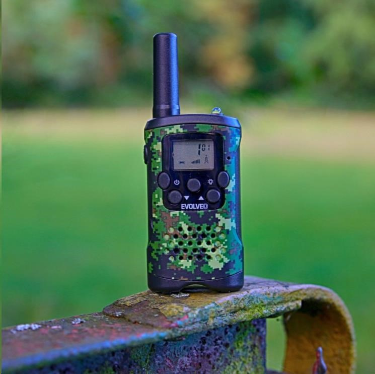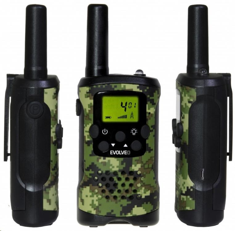 Dodávána s dobíjecími bateriemi, velký displej, dosah až 8 km v otevřeném prostoru, výkon 0.5 W, PMR 446 standard, VOX, CALL, Roger Beep, CTCSS, integrovaná LED svítilna, barva Army camouflage