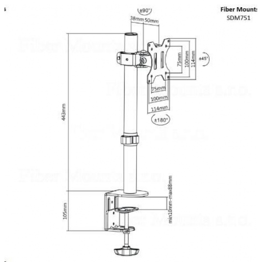 Fiber Mounts SDM751 - levný stolní držák na monitor Kvalitní nastavitelný stolní držák na monitor 13-32", otočný, sklopný, výškově stavitelný Univerzální stolový držák pro uchycení monitoru s úhlopříčkou 13-32". Spolehlivé a bezpečné upnutí, 2 možnosti ukotvení na jakoukoliv vodorovnou plochu o síle 10-88mm. Polohování obrazovky otáčením do stran, náklonem a výškovou regulací. Velmi pevná a bezpečná konstrukce z oceli. Nosnost 8kg, podpora VESA standardu 75x75 a 100x100. Díky své kvalitě a velmi příznivé ceně se tento držák stal velmi oblíbeným a vyhledávaným pro instalaci v domácnostech a ve školních učebnách, velmi často se s ním setkáte i ve firmách, kancelářích a prodejnách. Levný držák na monitor, televizor, tablet nebo EET pokladnu s úhlopříčkou 13-32 palců, VESA standard, otočný, sklopný, výškové nastavení, 2 typy ukotvení - Fiber Mounts SDM751 / drzakyastolky.cz Technické údaje: maximální zatížení 8kg podporuje VESA standardy 75x75 a 100x100 možnost rozšíření na VESA 200x100 nebo 200x200 doporučená úhlopříčka obrazovky 13 až 32" vhodný na monitory, televizory, tablety i EET pokladny otáčení do stran +/- 90° náklon +/- 45° celková výška 443mm výškové polohování obrazovky upnutí na vodorovnou plochu o síle 10-88mm součástí balení 2 typy upnutí bezpečné a spolehlivé zavěšení obrazovky fixace kabeláže materiál ocel barva černá záruka 2 roky Držák podporuje VESA standardy: VESA 75x75 VESA 100x100.