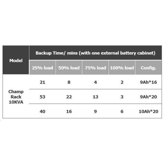 | Backup time - 1x Battery Bank (20pcs 9Ah) | |