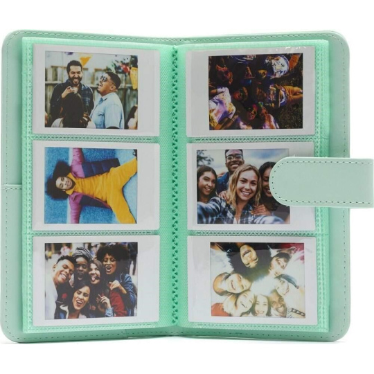 Foto album je určeno pro fotografie Instax Mini a dokáže pojmout celkem 108 snímků na 18 stranách.  Materiál: polyuretanová kůže v pěti různých barvách..