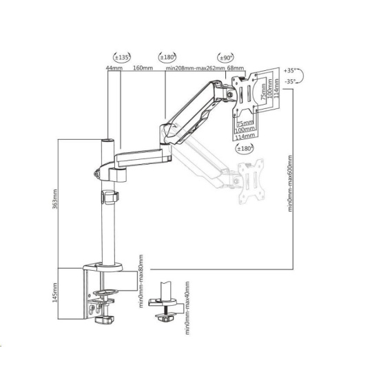 Full motion držák monitoru Fiber Mounts M7C75 Plně nastavitelný stolní držák na monitory 13-32", VESA 75x75 a 100x100, nosnost 8kg Nabízíme velmi pěkný designový monitorový držák vynikající konstrukce, který podporuje plnou nastavitelnost polohy obrazovky: dvojí nastavení výšky (na nosníku, ramenem s plynovým pístem), nastavení vzdálenosti monitoru od nosníku, otáčení na obě strany bez omezení, velký náklon jak nahoru tak dole. Flexibilitu zvyšují i dodávané 2 typy uchycení na stolovou desku - na okraj stolu nebo do prostoru stolu přes průchodku. Držák monitoru Fiber Mounts M7C75 uživatele uchvátí jak opravdu krásným vzhledem, tak vynikajícím provedením a skvělou funkčností. Monitorový držák flexibilní polohovatelný Fiber Mounts M7C75 vás mile překvapí svou vynikající kvalitou, pěkným vzhledem a vynikající nastavitelností Technické údaje: nosnost 8kg podporuje VESA standardy 75x75 a 100x100 nastavení výšky po celé délce nosníku 363mm nastavení výšky ramenem s pístem 150mm celkové nastavení výšky 0-600mm otáčení do stran +/- 360° náklon +/- 35° nastavení vzdálenosti od nosníku 44-534mm funkce PIVOT - otočení monitoru na šířku nebo na výšku korekce roviny monitoru systém pro vedení kabeláže 2 úchyty na stolovou desku: na okraj stolu nebo do prostoru stolové desky přes průchodku full motion nastavení polohy vynikající konstrukce TOP kvality krásný moderní design velmi odolná a stabilní konstrukce materiál ocel a hliník barevné provedení černé záruka 3 roky.