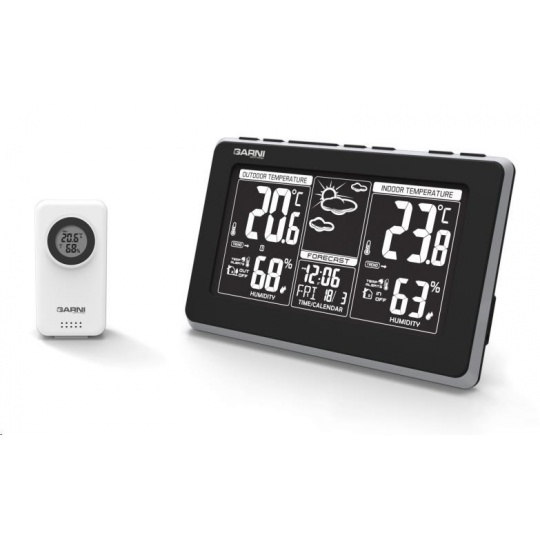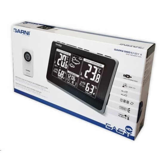 Meteorologická stanice s inverzním LCD displejem s časem řízeným rádiovým signálem DCF-77, budíkem, měřením vnitřní teploty a relativní vlhkosti, bezdrátovým čidlem pro měření vnější teploty a relativní vlhkosti a USB portem pro napájení externích zařízení. Mobilní telefon a USB kabel nejsou součástí balení - inverzní LCD displej o rozměrech 169 x 94 mm s možností stálého osvětlení při napájení síťovým adaptérem, nebo krátkodobým osvětlením na 8 s při napájení bateriemi - dva stupně jasu osvětlení displeje, možnost vypnutí osvětlení displeje (při napájení síťovým adaptérem) - při napájení pouze bateriemi lze displej rozsvítit zvukem, např. klepnutím, tlesknutím apod. - velikost číslic na displeji – čas 12,5 mm, datum a zkratka názvu dne 8 mm, vnitřní a vnější teplota 38 mm, vnitřní a vnější relativní vlhkost 23 mm - čas řízený signálem DCF-77 s možností manuálního nastavení - ikona příjmu signálu DCF-77 - 12ti, nebo 24 hodinový formát zobrazení času - možnost nastavení časového pásma od -12 do +12 hodin - budík s 2 budícími časy s funkcí opakovaného buzení (Snooze) nastavitelného od 3 do 20 minut - budící signál - 10 sekund 1 pípnutí za sekundu, 10 sekund 2 pípnutí za sekundu a poté stálé 4 pípnutí za sekundu - 13 ikon předpovědi počasí v 6 úrovních (jasno, polojasno, oblačno, déšť, bouřky a sněžení) na základě sledování barometrického tlaku vestavěným barometrickým čidlem - zobrazení hodnot vnitřní a vnější teploty a relativní vlhkosti - šipky tendence vývoje vnitřní a vnější teploty - možnost nastavení alarmu horní a dolní meze vnitřní a vnější teploty (akustickým signálem a ikonou na displeji) - zobrazení teploty ve °C, nebo °F - možnost použití až 3 bezdrátových čidel GARNI 040H (jedno je součástí dodávky) - funkce automatického přepínání kanálů - bezdrátový přenos hodnot vnější teploty relativní vlhkosti na frekvenci 433 MHz - ikona příjmu signálu bezdrátového čidla - USB port pro nabíjení mobilních zařízení (pouze při napájení hlavní jednotky síťovým adaptérem), maximální nabíjecí proud 1 000 mA - napájení síťovým adaptérem nebo bateriemi - možnost postavení, nebo zavěšení - barva černá se stříbrnou Bezdrátové čidlo GARNI 040H - vlhkosti odolné, krytí IP44 (odolné proti stříkající vodě) - kruhový displej o průměru 19 mm - velikost číslic na displeji: teplota a relativní vlhkost 5 mm - měření teploty a relativní vlhkosti - 3 kanály - maximální RF výkon 10 dBm (10 mW) - možnost postavení a zavěšení - barva bílá Obsah balení: 1 x hlavní jednotka GARNI 560 EASY II 1 x bezdrátové čidlo GARNI 040H 1 x síťový adaptér český, slovenský, německý, anglický, polský a maďarský návod.