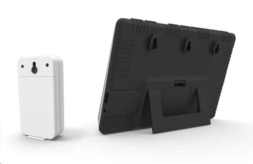 Meteorologická stanice s inverzním LCD displejem s časem řízeným rádiovým signálem DCF-77, budíkem, měřením vnitřní teploty a relativní vlhkosti, bezdrátovým čidlem pro měření vnější teploty a relativní vlhkosti a USB portem pro napájení externích zařízení. Mobilní telefon a USB kabel nejsou součástí balení - inverzní LCD displej o rozměrech 169 x 94 mm s možností stálého osvětlení při napájení síťovým adaptérem, nebo krátkodobým osvětlením na 8 s při napájení bateriemi - dva stupně jasu osvětlení displeje, možnost vypnutí osvětlení displeje (při napájení síťovým adaptérem) - při napájení pouze bateriemi lze displej rozsvítit zvukem, např. klepnutím, tlesknutím apod. - velikost číslic na displeji – čas 12,5 mm, datum a zkratka názvu dne 8 mm, vnitřní a vnější teplota 38 mm, vnitřní a vnější relativní vlhkost 23 mm - čas řízený signálem DCF-77 s možností manuálního nastavení - ikona příjmu signálu DCF-77 - 12ti, nebo 24 hodinový formát zobrazení času - možnost nastavení časového pásma od -12 do +12 hodin - budík s 2 budícími časy s funkcí opakovaného buzení (Snooze) nastavitelného od 3 do 20 minut - budící signál - 10 sekund 1 pípnutí za sekundu, 10 sekund 2 pípnutí za sekundu a poté stálé 4 pípnutí za sekundu - 13 ikon předpovědi počasí v 6 úrovních (jasno, polojasno, oblačno, déšť, bouřky a sněžení) na základě sledování barometrického tlaku vestavěným barometrickým čidlem - zobrazení hodnot vnitřní a vnější teploty a relativní vlhkosti - šipky tendence vývoje vnitřní a vnější teploty - možnost nastavení alarmu horní a dolní meze vnitřní a vnější teploty (akustickým signálem a ikonou na displeji) - zobrazení teploty ve °C, nebo °F - možnost použití až 3 bezdrátových čidel GARNI 040H (jedno je součástí dodávky) - funkce automatického přepínání kanálů - bezdrátový přenos hodnot vnější teploty relativní vlhkosti na frekvenci 433 MHz - ikona příjmu signálu bezdrátového čidla - USB port pro nabíjení mobilních zařízení (pouze při napájení hlavní jednotky síťovým adaptérem), maximální nabíjecí proud 1 000 mA - napájení síťovým adaptérem nebo bateriemi - možnost postavení, nebo zavěšení - barva černá se stříbrnou Bezdrátové čidlo GARNI 040H - vlhkosti odolné, krytí IP44 (odolné proti stříkající vodě) - kruhový displej o průměru 19 mm - velikost číslic na displeji: teplota a relativní vlhkost 5 mm - měření teploty a relativní vlhkosti - 3 kanály - maximální RF výkon 10 dBm (10 mW) - možnost postavení a zavěšení - barva bílá Obsah balení: 1 x hlavní jednotka GARNI 560 EASY II 1 x bezdrátové čidlo GARNI 040H 1 x síťový adaptér český, slovenský, německý, anglický, polský a maďarský návod.