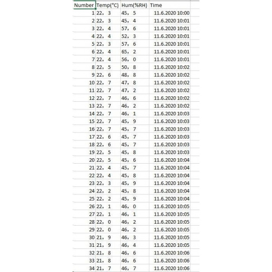 paměť pro 20 010 hodnot teploty a vlhkosti LCD displej o rozměrech 22 x 20 mm pro zobrazení aktuálních, minimálních a maximálních naměřených hodnot možnost nastavení načítání dat od 2 sekund do 24 hodin (2 až 30 s, dále 1, 5, 15, 30 min, dále 1, 5,12, 24 hodin) připojení k počítači přes USB port nastavitelný alarm horní a dolní meze pro teplotu a relativní vlhkost program TempRH Datalogger pro zobrazení naměřených hodnot pro OS Windows až do verze Windows 10 (32 bit a 64 bit) zobrazení naměřených dat v reálném čase v přiloženém programu včetně grafu možnost odloženého zahájení měření data ve formě zprávy v pdf fornátu a tabulky ve formátu *.csv a ve formátu *.imtr (Meter Files - lze otevřít přiloženým programem) součástí balení je datalogger, poutko, baterie, CD s programem a návod.