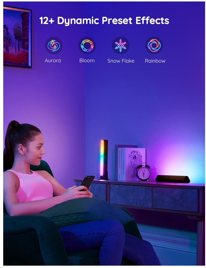 Vylepšete své herní, filmové a hudební zážitky s živým chytrým osvětlením Govee Flow Plus. 16 milionů barev s 12 režimy, z toho 4 režimy pro synchronizaci s hudbou, povznese zážitek ze sledování televize nebo hraní her na novou úroveň. Ovládají se hlasem přes Siri, Amazon Alexa nebo Google Assistant, přes aplikaci nebo přes Control box. Nebudete proto ani muset vstávat z gauče. Díky univerzálním držákům je můžete využít kreativně a přizpůsobit vašim potřebám na TV nebo ve volném prostoru. Barevné podsvícení opticky zvětšuje obraz, šetří oči a má živostnost až 50.000 hodin.