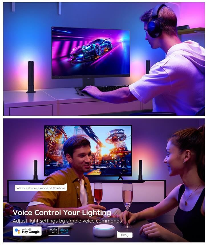 Vytvořte si ideální filmovou nebo herní atmosféru pomocí jednoduchých hlasových příkazů. Světla jsou kompatibilní s asistenty Alexa, Google Assistant a Siri. WiFi modul je zabudován v kameře, pouze kamera je připojena k ovládacímu boxu. Nyní můžete Govee Flow Plus zapnout/vypnout, upravit úrovně jasu nebo změnit jejich barvu pomocí hlasových příkazů z pohodlí své pohovky nebo postele. Ovládat světla je možné také přes ovládací jednotku Control Box nebo přes aplikaci ve smartphonu nebo tabletu.