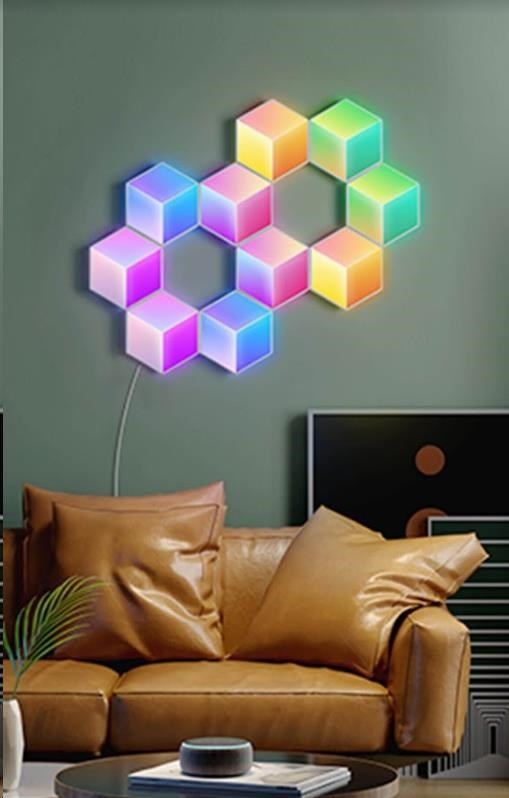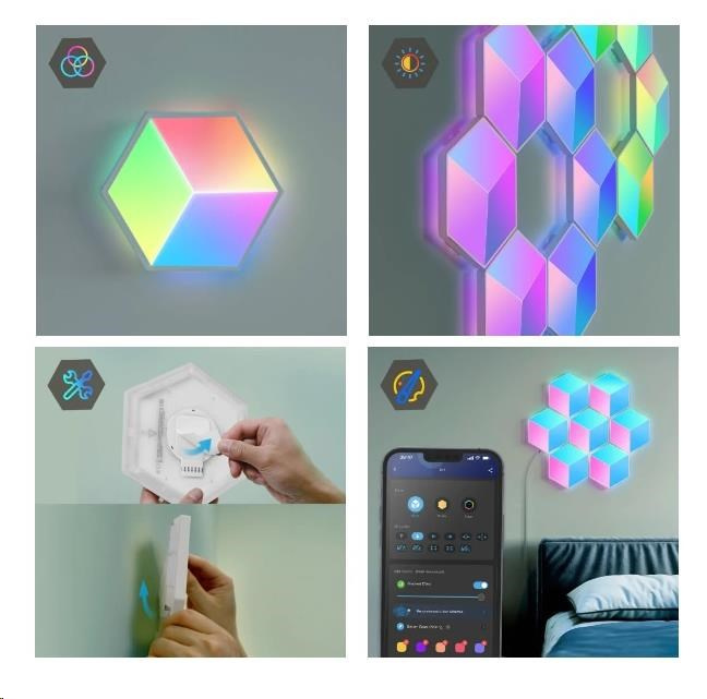 Vylepšete interiér a herní, filmové a hudební zážitky s designovým světlem Hexa PRO 3D Smart LED. Díky technologii RGBIC zobrazuje až 57 barev najednou. Barevnost si můžete nastavit po jednotlivých sekcích a kreativně si pohrát s 3D efektem osvětlení. Celkově umí zobrazit až 16 milionů barev s intenzitou 1-100%. Určitě si vyberete z mnoha režimů osvětlení a při poslouchaní oblíbené hudby si můžete zvolit také ze 6 rytmických režimů. Světla se ovládají hlasem přes Siri, Amazon Alexa nebo Google Assistant nebo přes aplikaci Govee Home na chytrém telefonu nebo tabletu. Světlo je určeno na instalaci na zeď a jeho tvar si můžete přizpůsobit podle vlastní fantazie. Jednoduchá instalace bez vrtání s životností až 50.000 hodin.