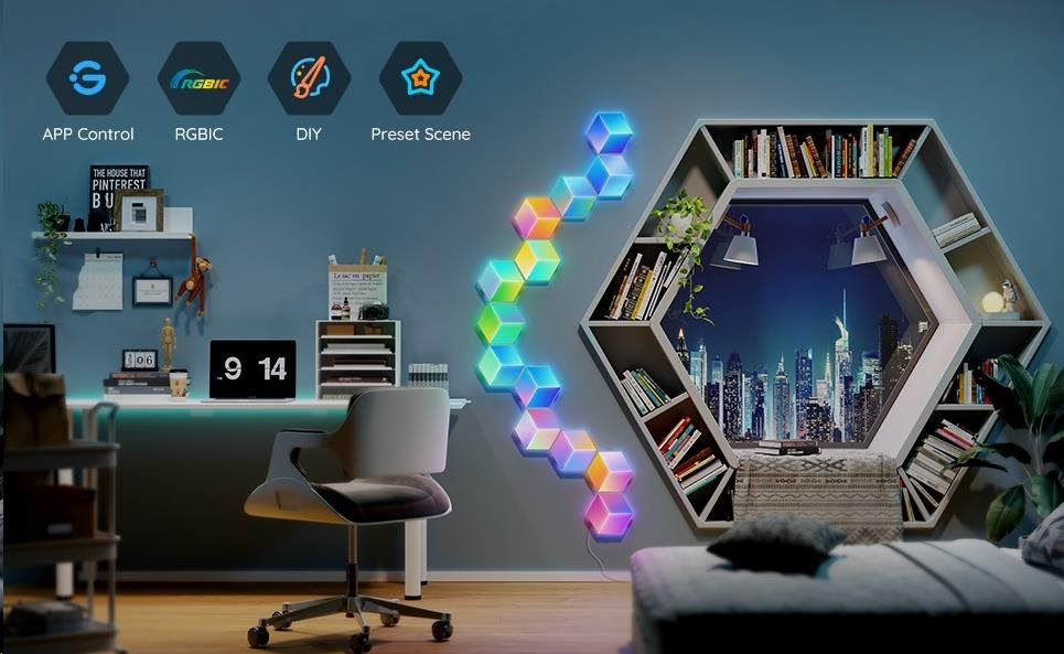 Govee Hexa Pro nabízí 38 různých režimů pro dokonalé naladění světelné atmosféry. Govee technologie RGBIC umí zobrazit až 57 barev najednou z celkové škály 16 milionů barev při intenzitě 1-100%. Může se také pochlubit životností až 50.000 hodin.