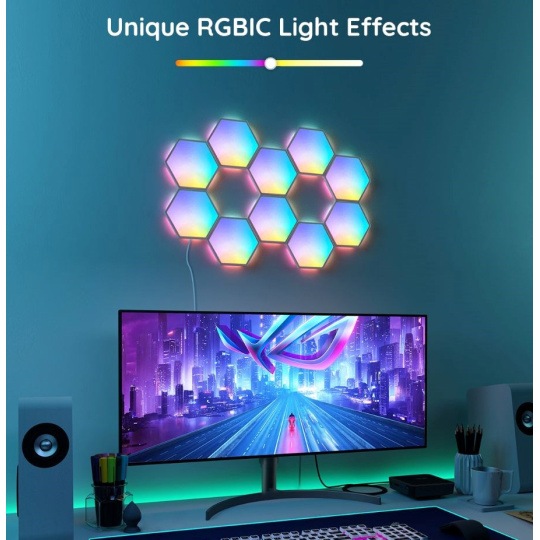 Díky vzájemné komunikaci panelů je možné s pomocí aplikace vytvořit nádherné, dynamické efekty. Technologie RGBIC pomáhá k ještě vyššímu jasu a kontrastu a vy si tak můžete vychutnat futuristické osvětlení svého herního doupěte nebo, ložnice nebo obývacího pokoje.