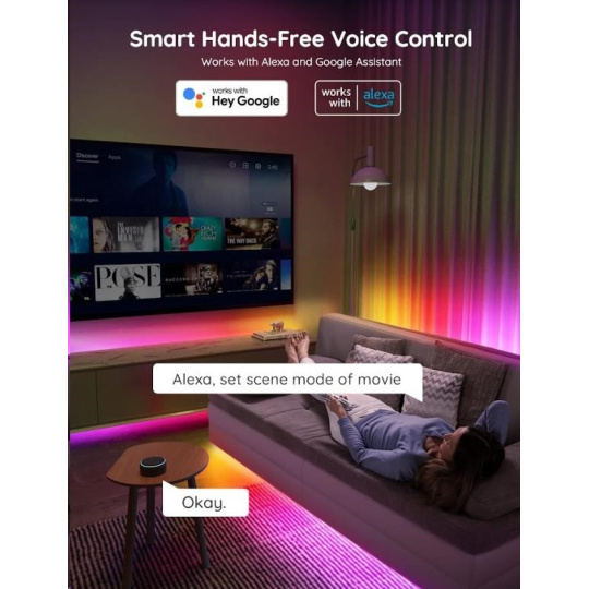 Spravujte nastavení barev a intenzity světla jednoduše pomocí aplikace Govee Home. Aplikace je zdarma ke stažení v Google Play a AppStore. Navíc získáte přístup k funkci časovače, DIY barvám, režimu videa, synchronizaci hudby a režimům scény. Rovněž si můžete pomocí časovače nastavit automatické vypnutí a zapnutí, třeba podle doby usínání a vstávaní. Ovládání hlasem je možné přes Siri, Amazon Alexa a Google Assistant.